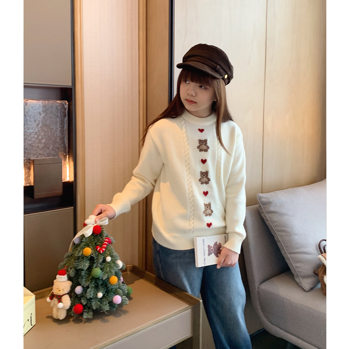 女大童小熊爱心毛衣2025冬装新款少女韩版套头线衫学生圆领针织衫