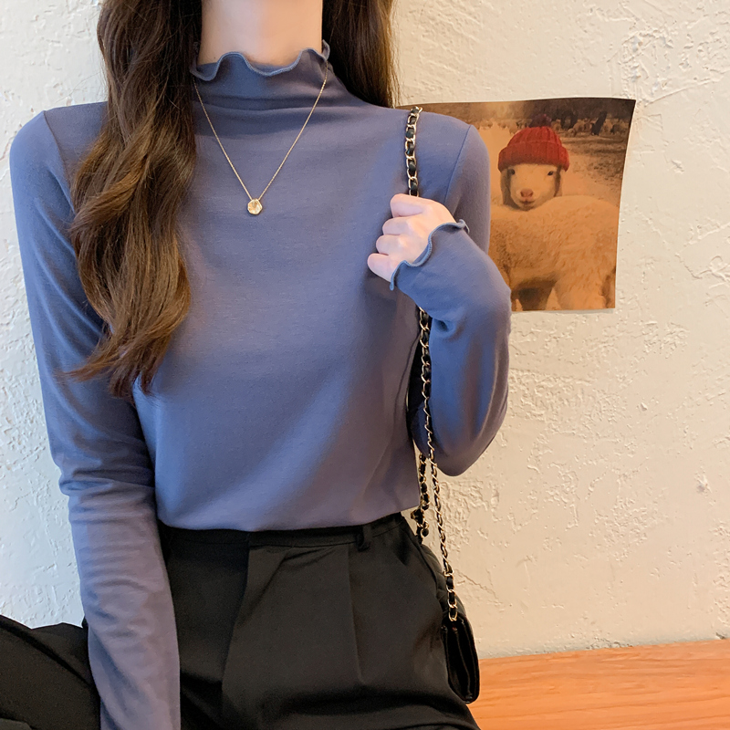 春秋季新款木耳边半高领波点t恤女长袖洋气修身内搭打底小衫上衣