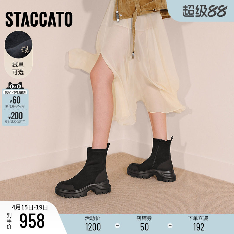 思加图新款百搭弹力靴黑色瘦瘦靴中靴厚底增高加绒女靴子Y2563DZ5