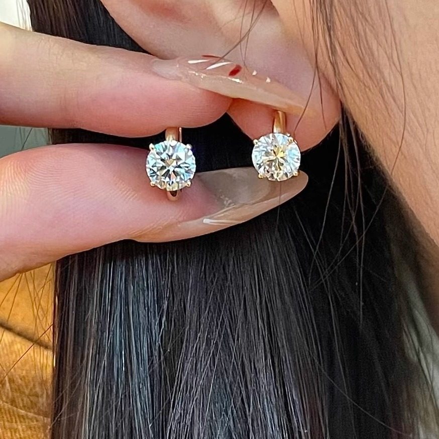 18K金一克拉培育钻石四爪黄金耳环耳扣耳圈女款简约经典耳饰送礼