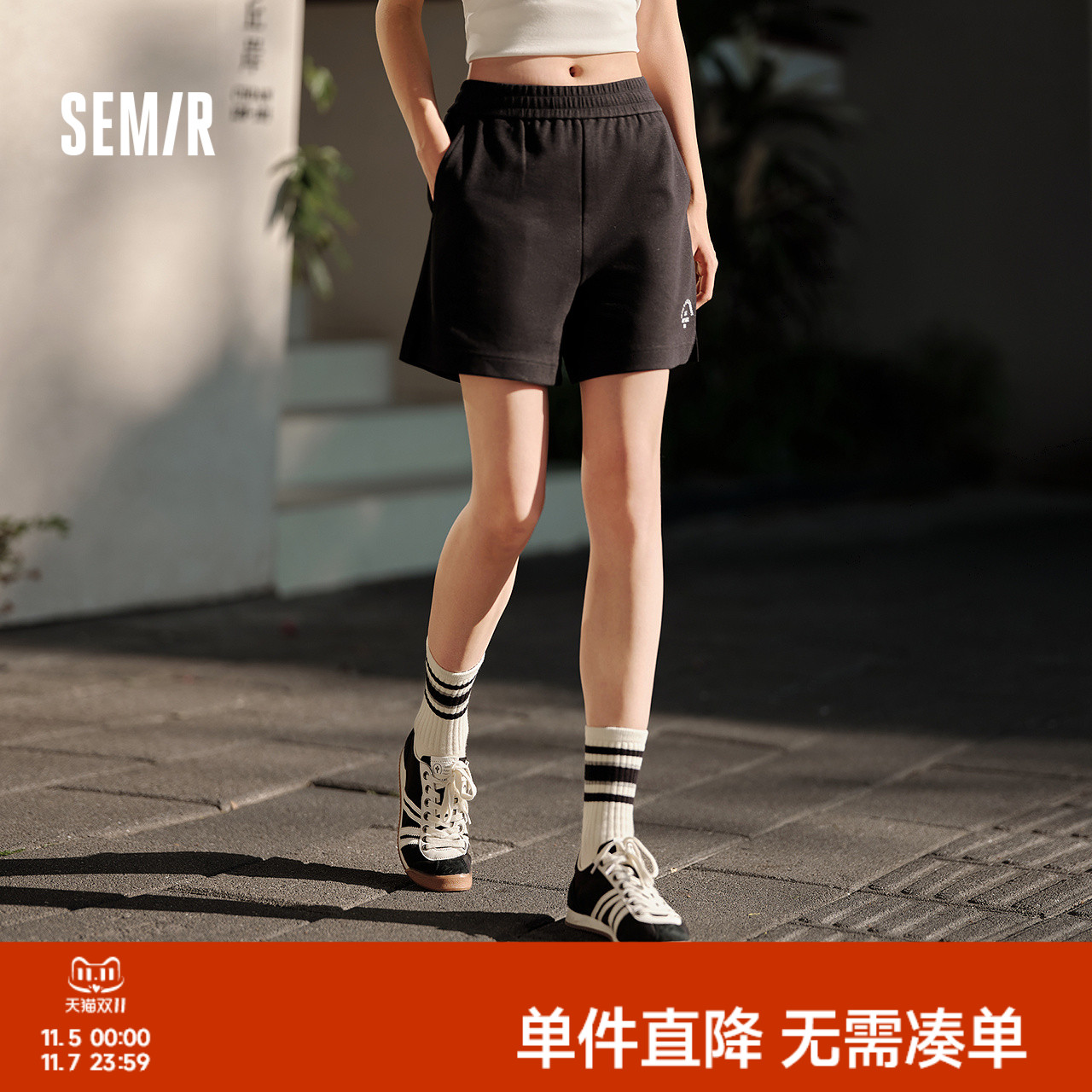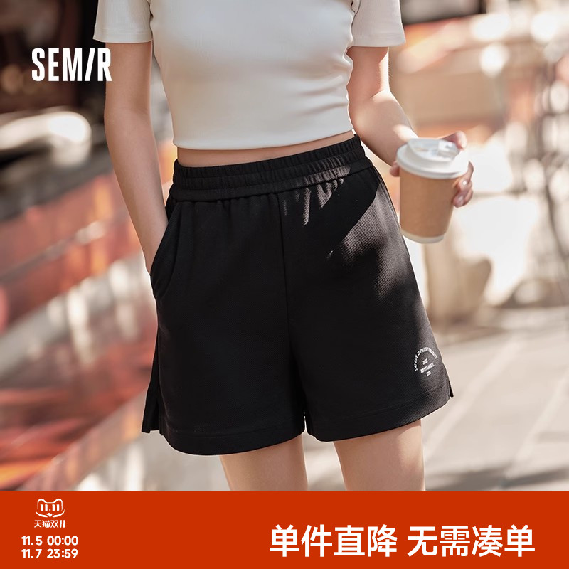 森马休闲裤女刺绣开叉直筒裤黑色运动裤夏季宽松质感短裤女生百搭