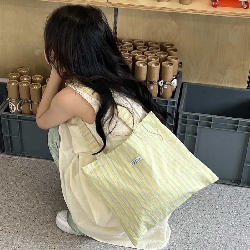 单肩帆布包女大容量托特包大学生上课腋下包通勤条纹双面背手提袋