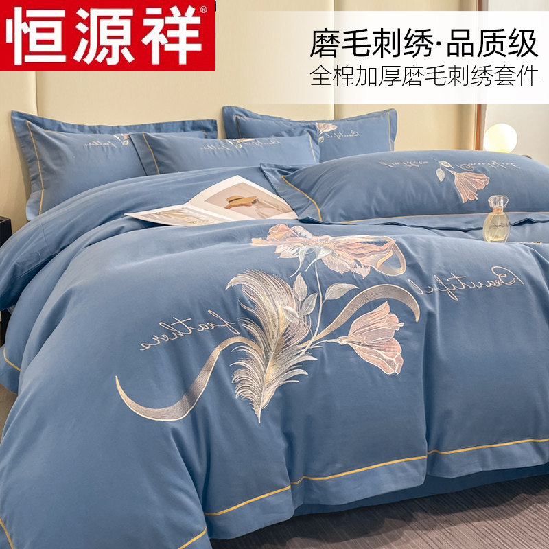 恒源祥全棉磨毛现代轻奢四件套纯棉被套床单床笠款四季通用床件套