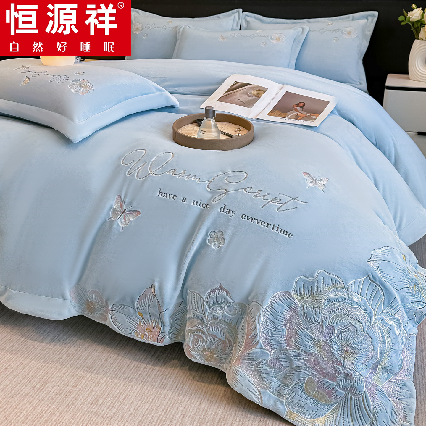 恒源祥轻奢刺绣牛奶绒床上四件套冬季法兰珊瑚绒加厚床单被套床品