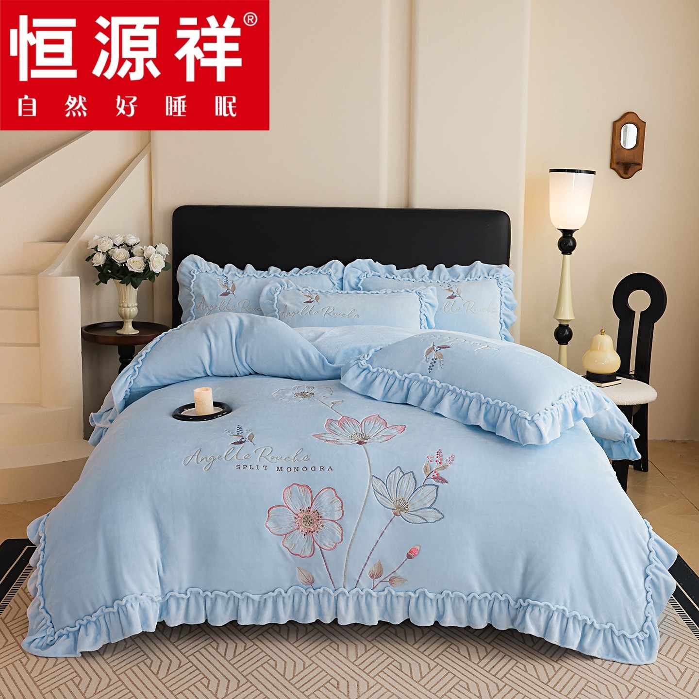恒源祥牛奶绒四件套新款秋冬季加厚保暖刺绣韩式被套床裙款法兰绒
