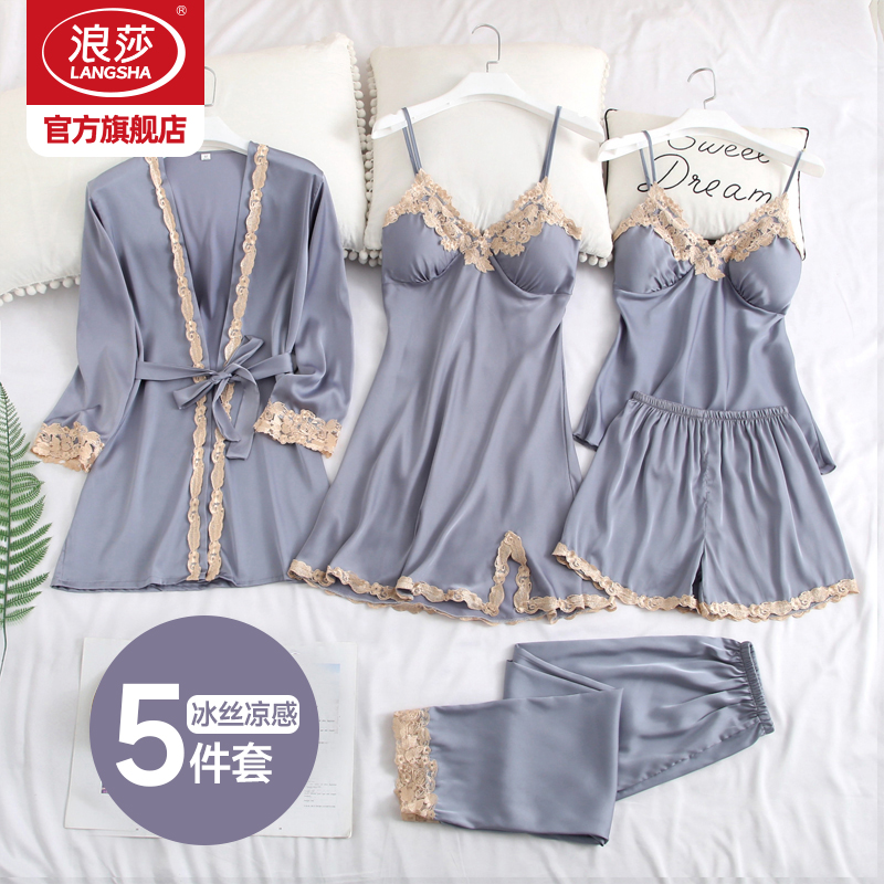 浪莎睡衣女冰丝秋季性感五件套仿丝绸睡裙春秋睡袍带胸垫家居服KF