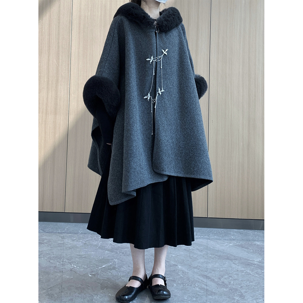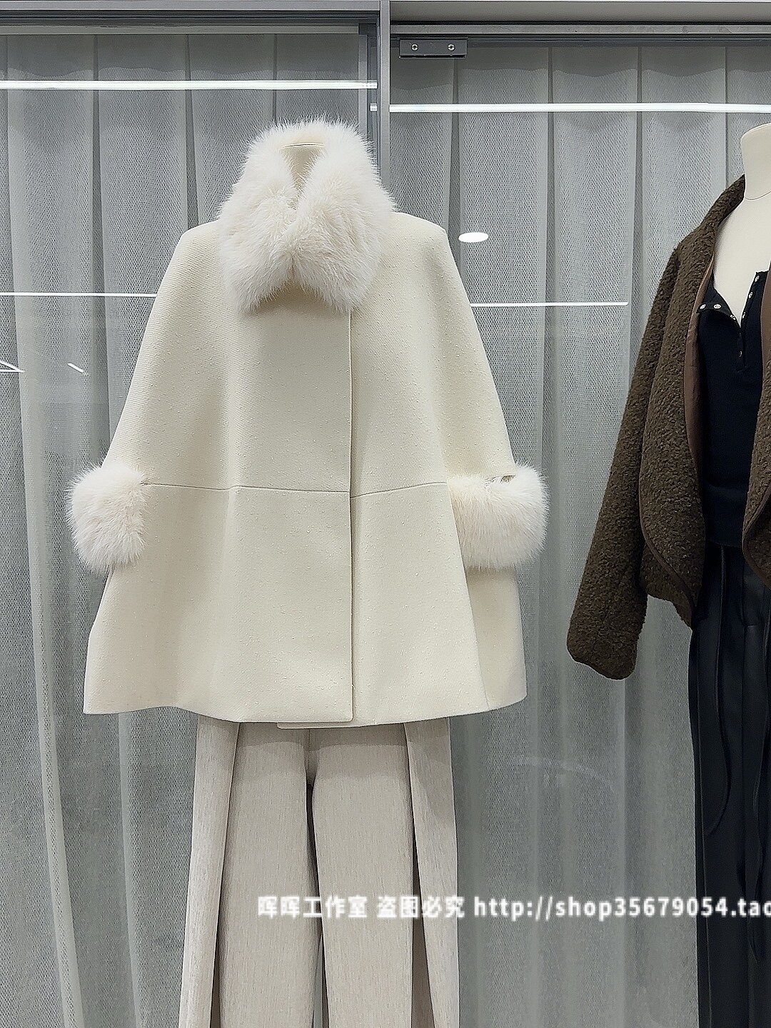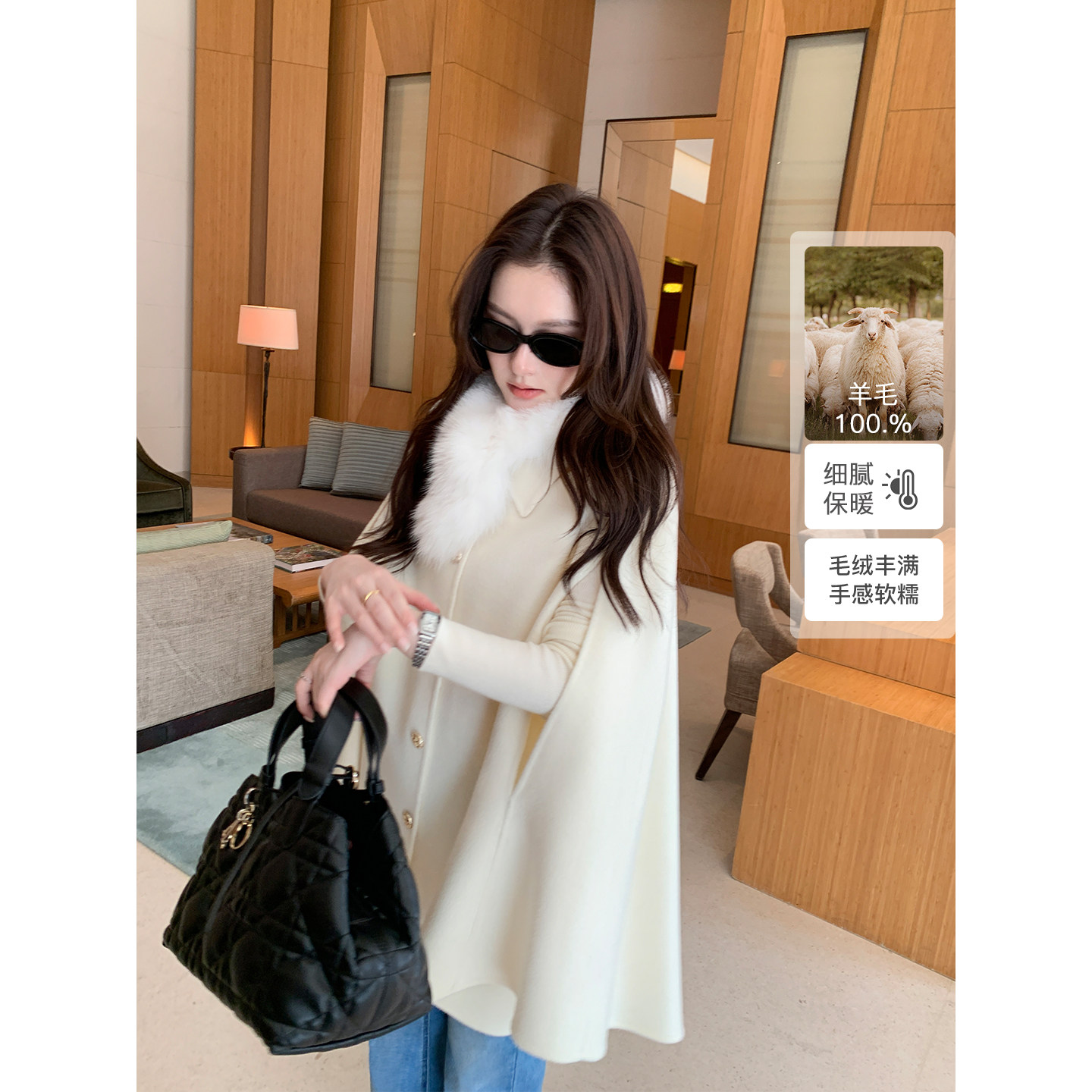 欧洲站狐狸毛围脖斗篷双面羊毛呢子大衣外套女中长款25冬季新款