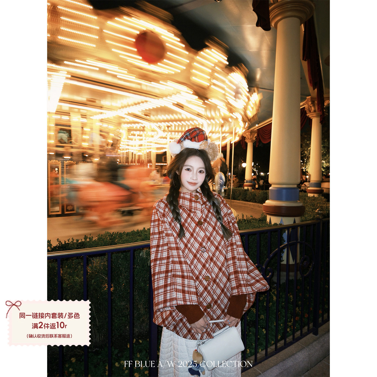 FF BLUE 圣诞限定 波尔多红节日感格纹毛呢斗篷外套女夹棉半身裙