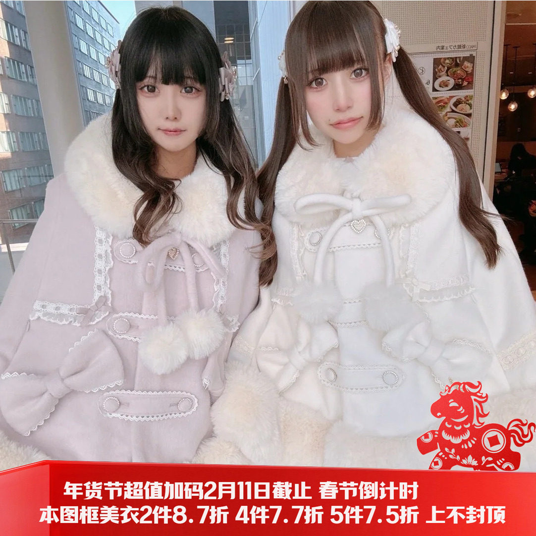 Meowchan日系冬季可爱量产型蕾系蝴蝶结长款毛呢斗篷大衣厚外套
