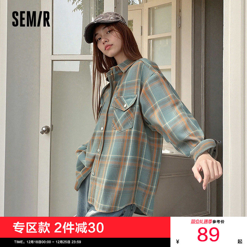 森马长袖衬衫女中长款慵懒宽松落肩休闲秋季chic复古格纹衬衣潮流
