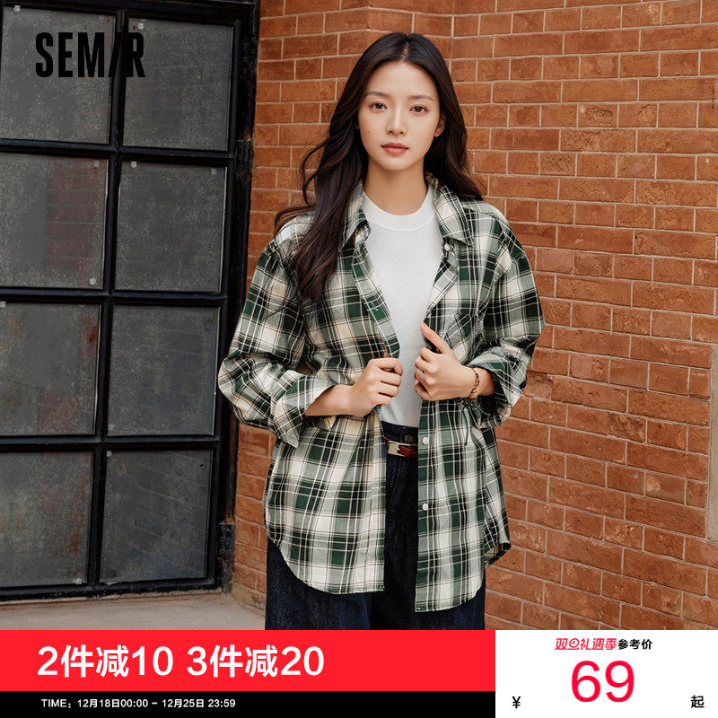 [商场同款]森马长袖衬衫女中长款慵懒宽松2025秋新款复古格子衬衣