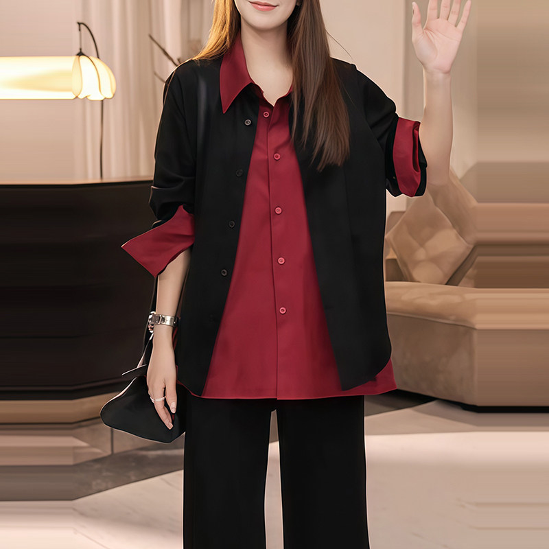 2026春冬新款松弛感穿搭假两件撞色长袖衬衫女中长款内搭休闲上衣