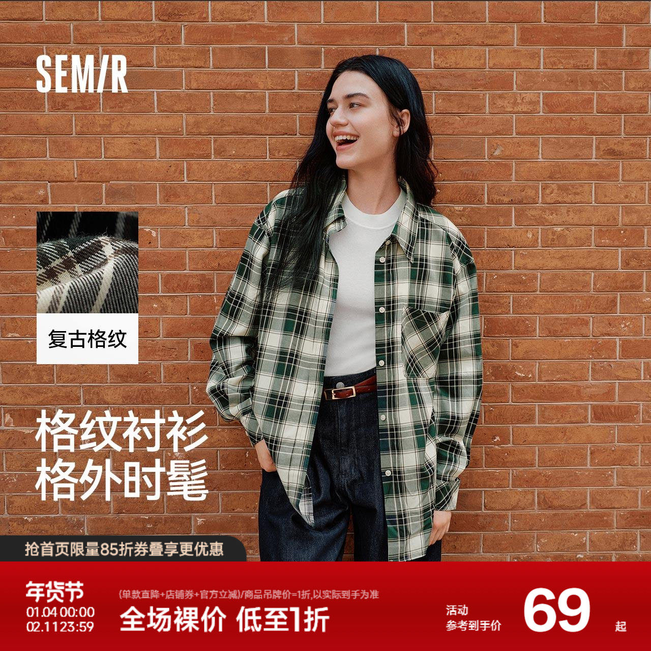 [商场同款]森马长袖衬衫女中长款慵懒宽松春新款女士绿黑格子衬衣