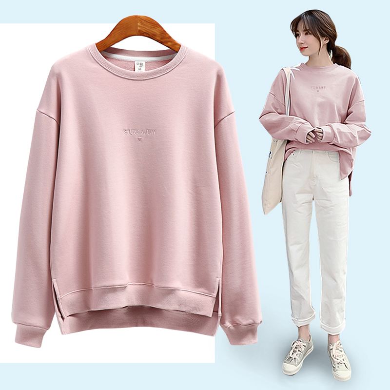 秋冬新款圆领开叉卫衣女加绒韩版宽松大码套头长袖小个子薄款上衣