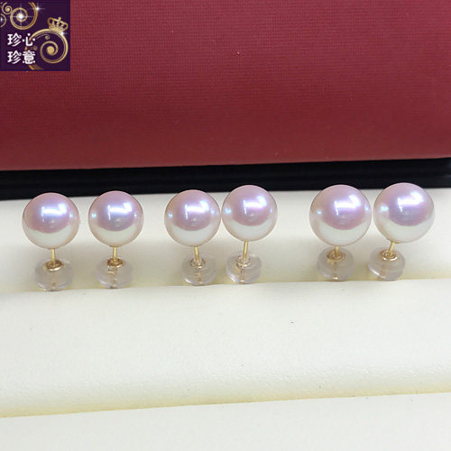 日本阿古屋天女樱花粉akoya天然海水珍珠耳钉 18K金正圆镜面光