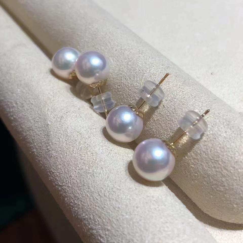 日本akoya天然海水珍珠18K金耳钉女正圆极强光8mm素钉珠子耳饰品
