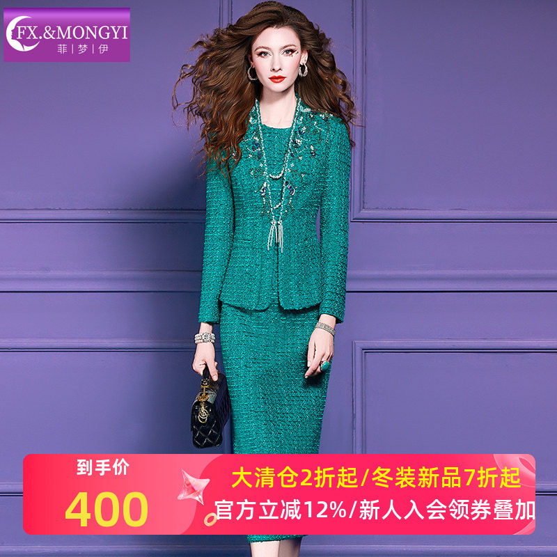 菲梦伊绿色小香风套装女秋季名媛千金感背心连衣裙配钉珠西装外套