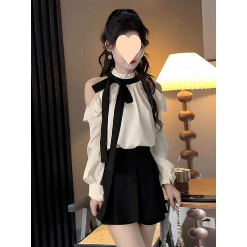 法式气质名媛套装裙女秋季设计感蝴蝶结露肩衬衫高腰半身裙两件套