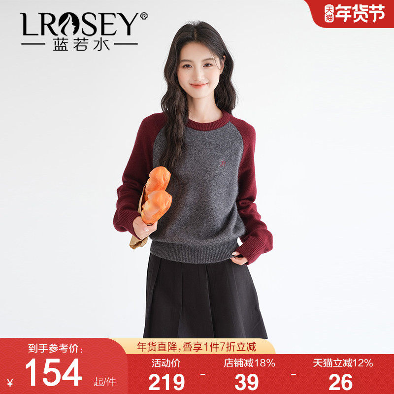 蓝若水大码春装新款撞色插肩袖圆领套头针织衫美式复古打底毛衣女
