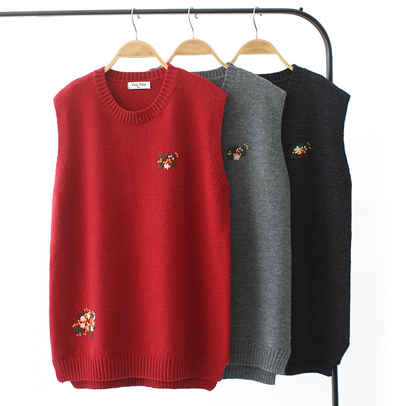 大码春装韩版新款打底衫胖MM中长款圆领手工花朵无袖百搭针织马夹