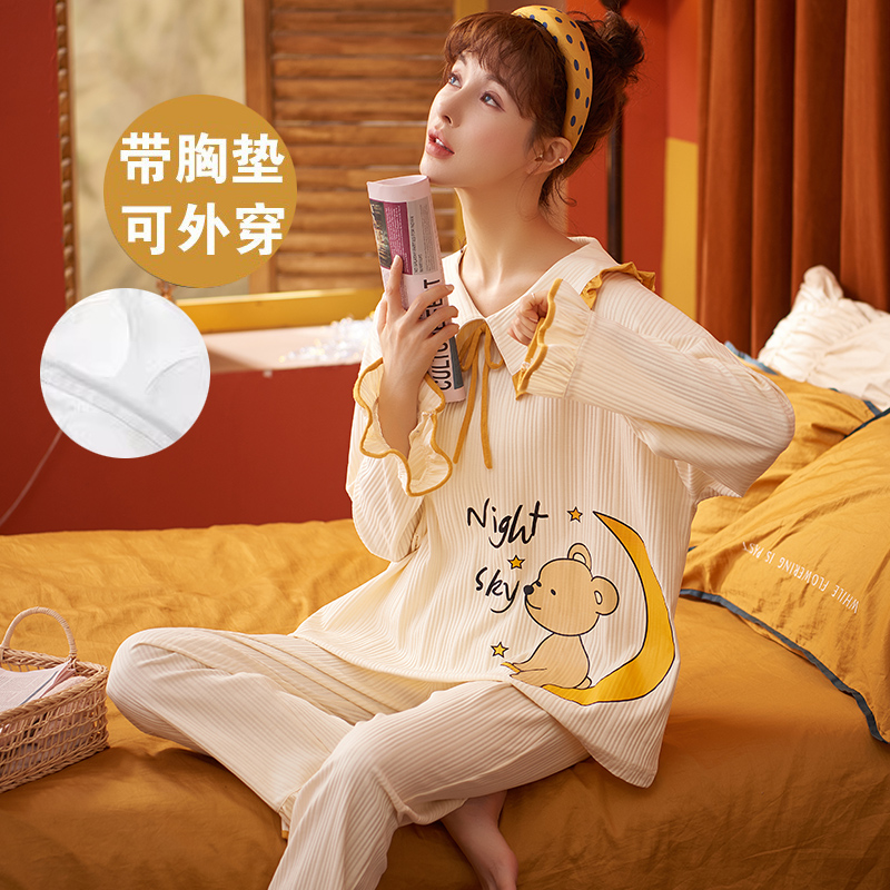 带胸垫睡衣女春秋季纯棉长袖韩版卡通可爱学生外穿休闲套装家居服