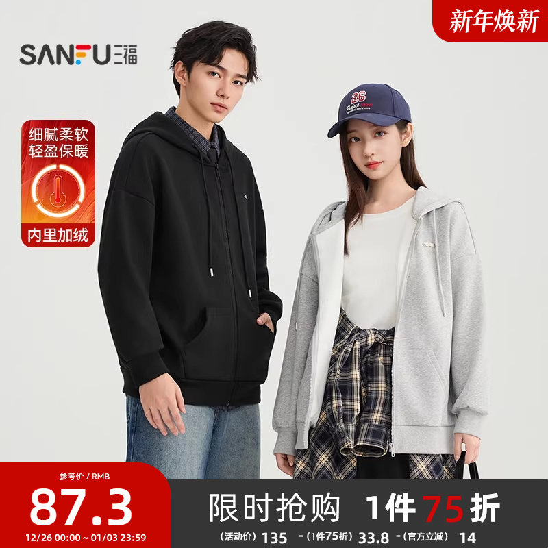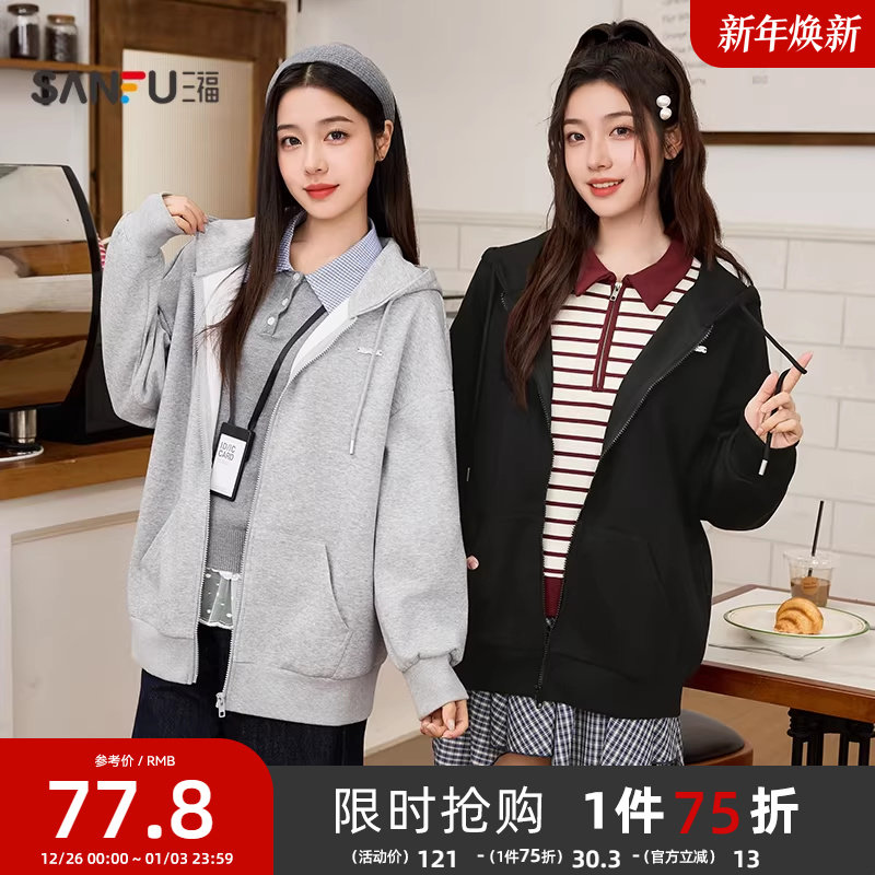 三福卫衣外套2025新款冬季加绒内里宽松开衫美式连帽情侣上衣女装