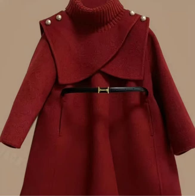 毛呢大衣女2024新款秋冬季加绒加厚中长款小个子新年战袍红色外套