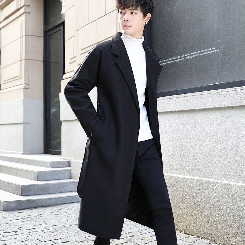 腰带风衣男中长款过膝韩版潮流秋冬季加厚毛呢大衣英伦风外套修身