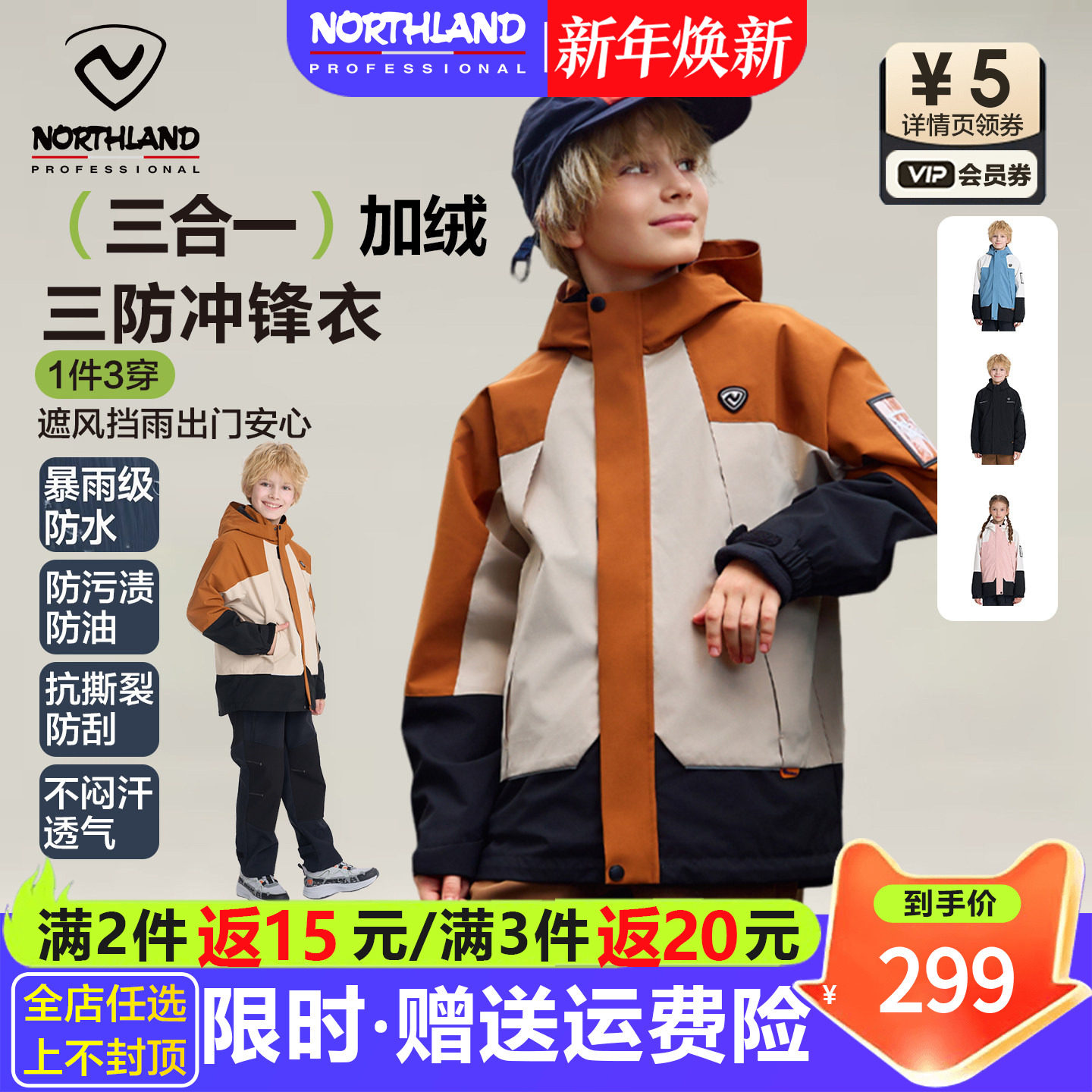 诺诗兰儿童冲锋夹克防风衣男童三合一可拆卸女童摇粒绒外套中大童
