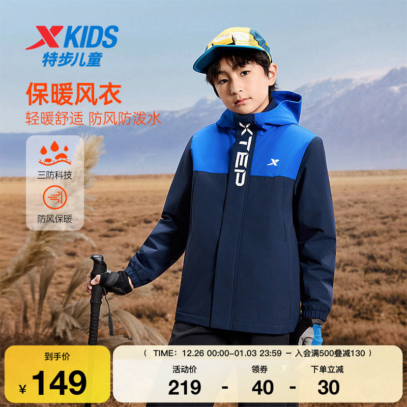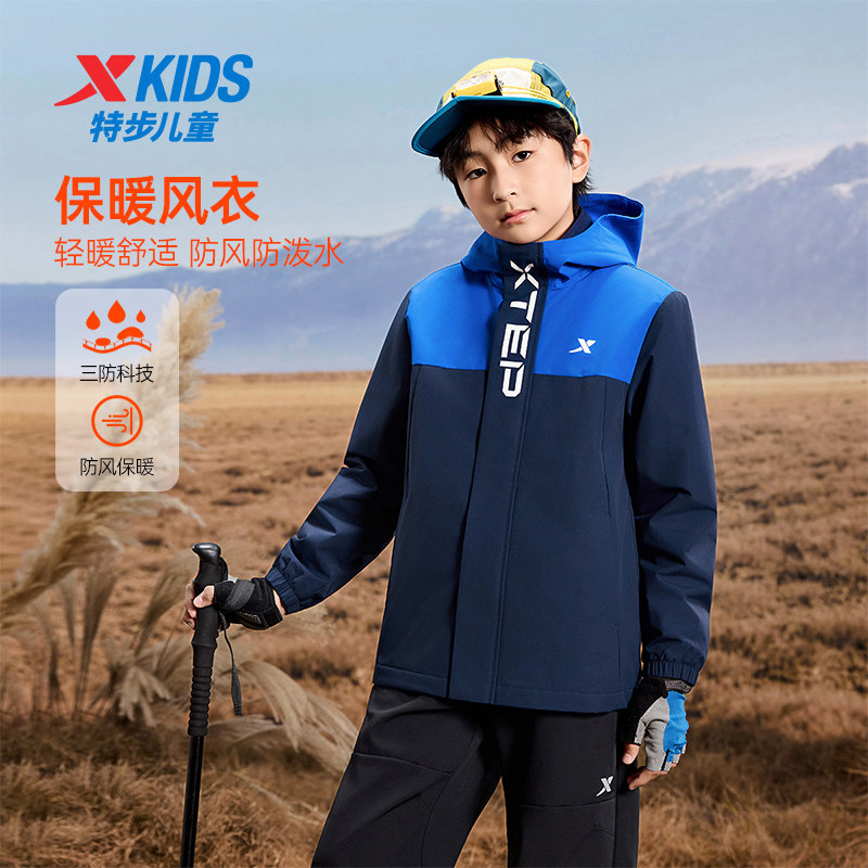 特步童装秋冬新款儿童运动风衣女童男童小中大童百搭连帽保暖外套
