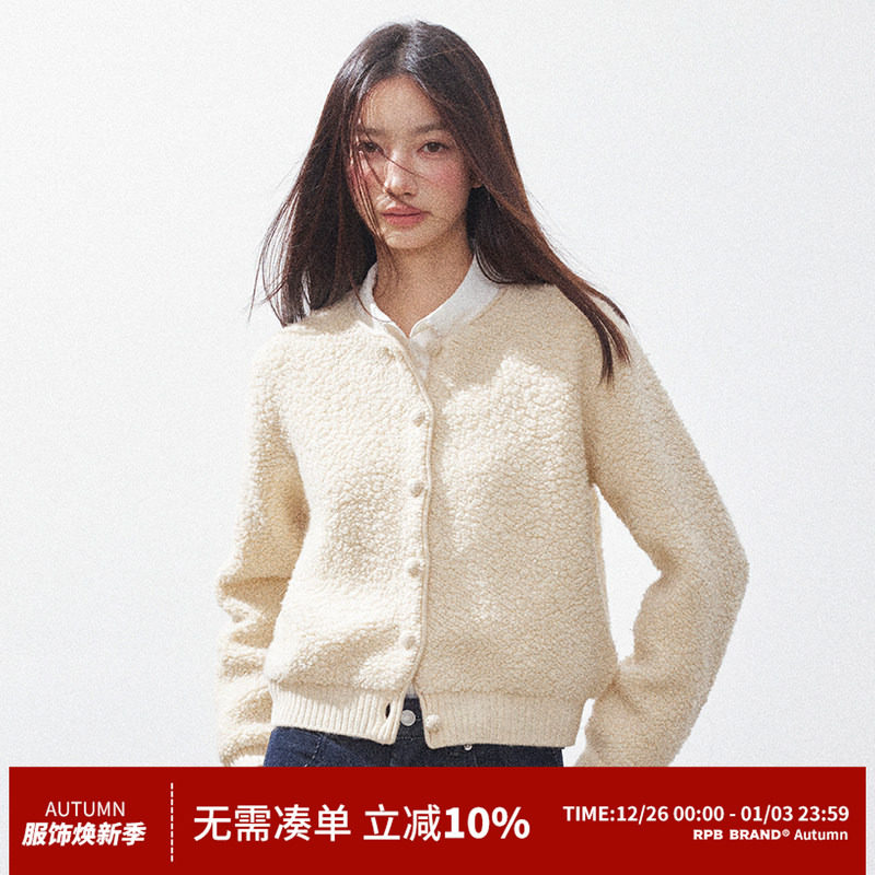 RPB BRAND纯羊毛简约修身短款羊羔毛外套女保暖羊羔绒棒球服夹克