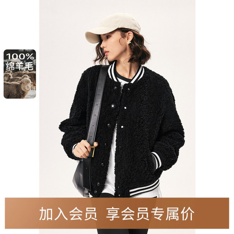 【全羊毛】诗凡黎美式学院风棒球服2024冬款羊羔毛流行短外套女