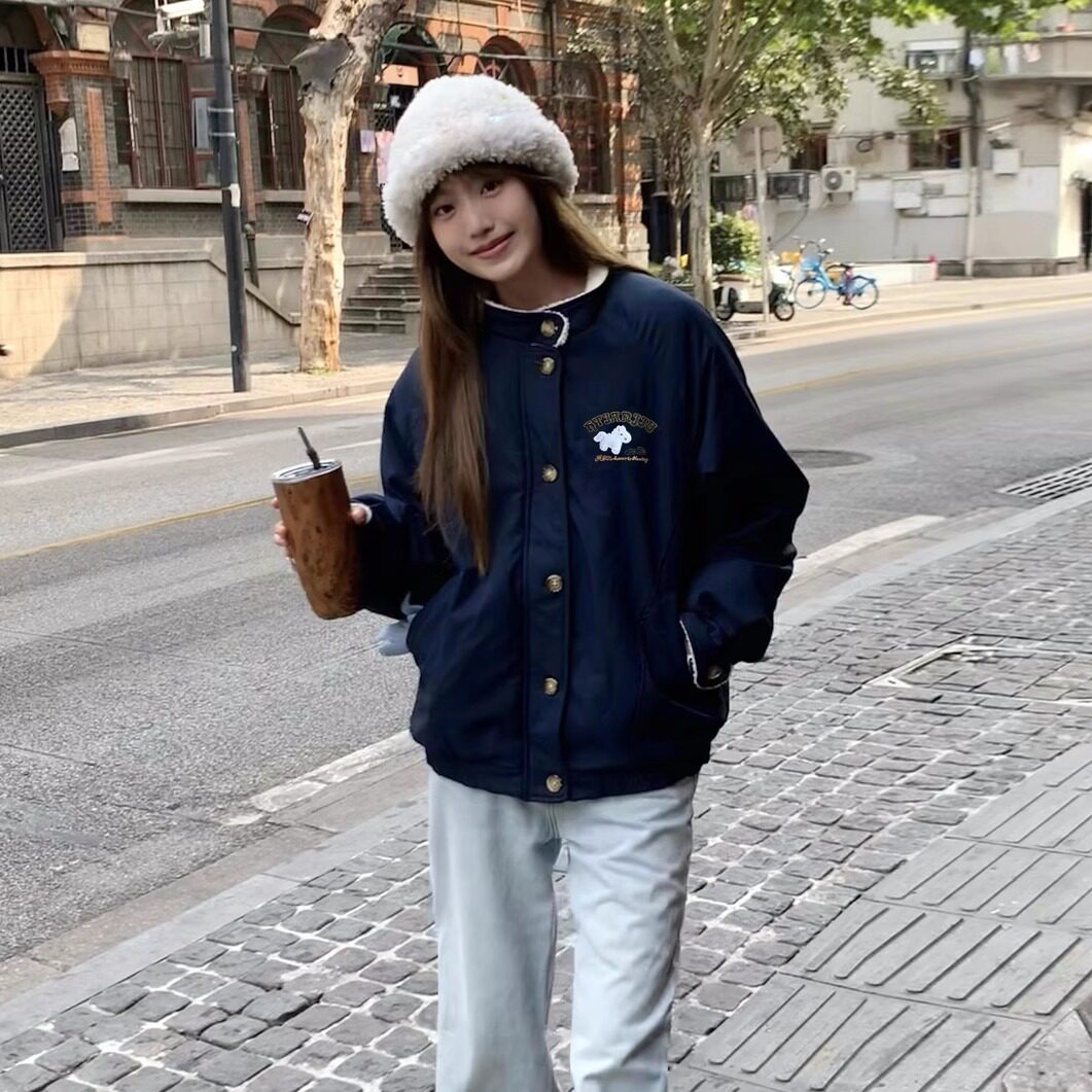 泡菜订制海军领羊羔毛外套女2025冬季新款韩版宽松加厚加绒棒球服