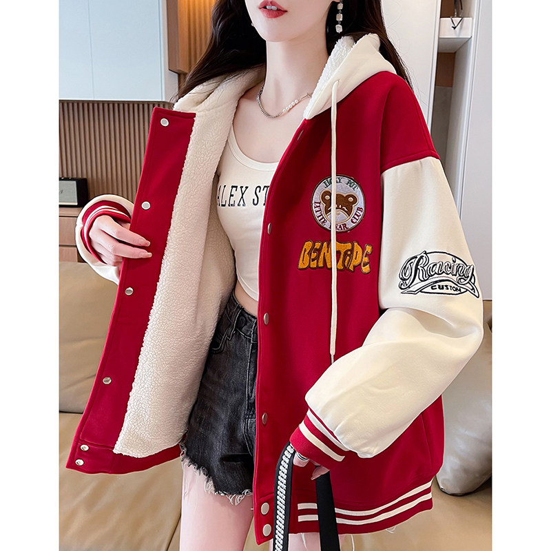 羊羔毛卫衣外套女秋冬2025新款初高中学生加绒加厚可爱棒球服棉衣