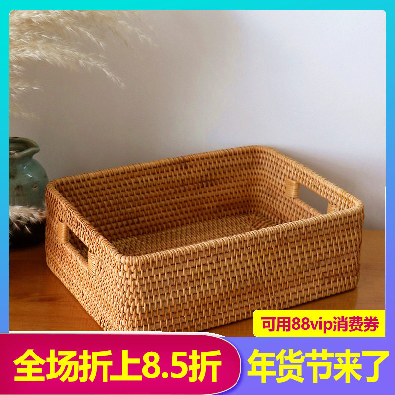 越南藤编收纳筐手工实木美式高档编织篮茶几杂物桌面长方形筐篮子