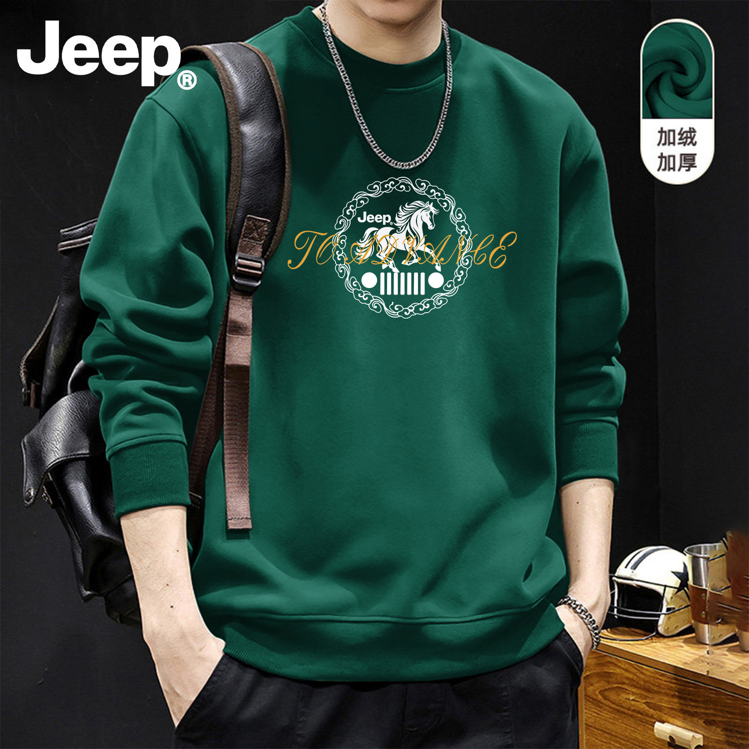 Jeep吉普绿色圆领卫衣男宽松百搭上衣服保暖加厚加绒内搭套头长袖