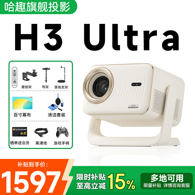 【哈趣x哈曼联名】哈趣H3Ultra家用超高清投影仪哈曼定制声学1080P家庭影院便携宿舍卧室智能投屏手机投影机