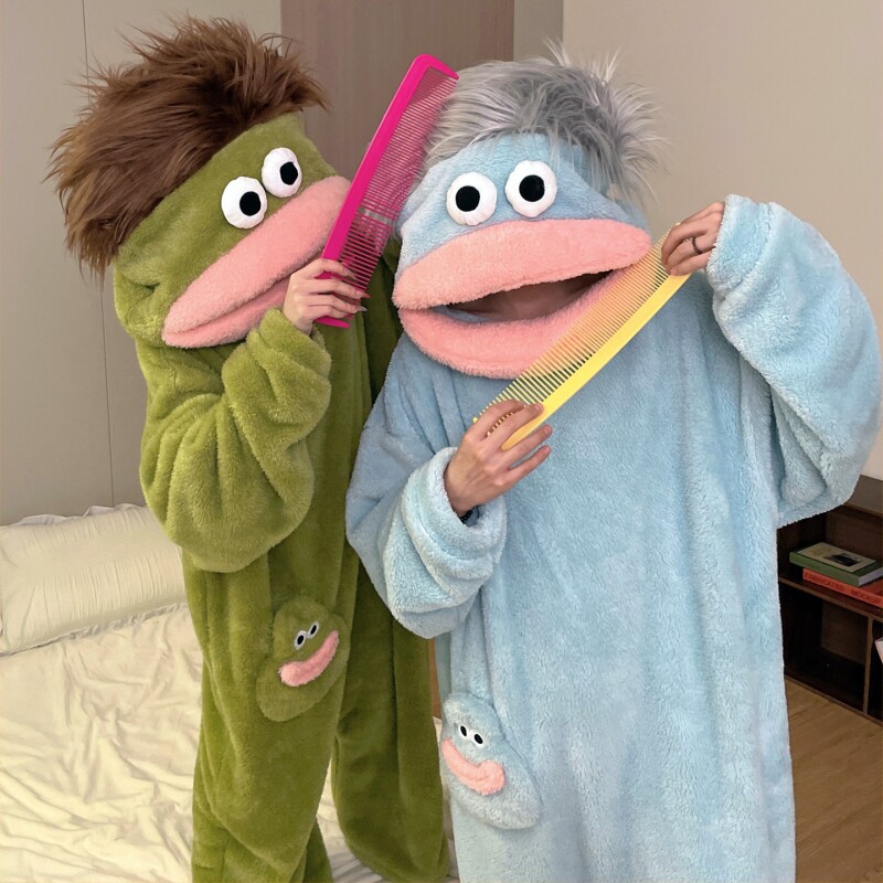 丑鱼儿童连体睡衣女款冬季珊瑚绒加厚保暖亲子搞怪抽象大嘴怪睡袍