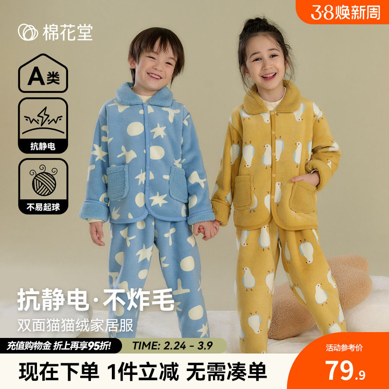 红豆居家儿童珊瑚绒睡衣冬男童加厚女童外穿保暖抗静电家居服套装