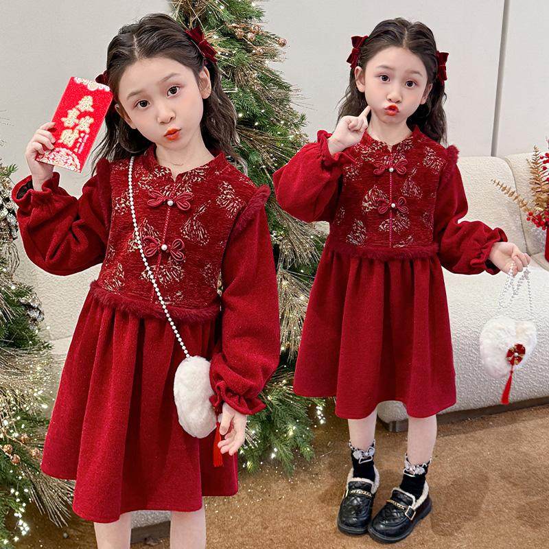 女童过年服裙子儿童拜年服加绒红色冬季女宝宝秋冬连衣裙新年三扣