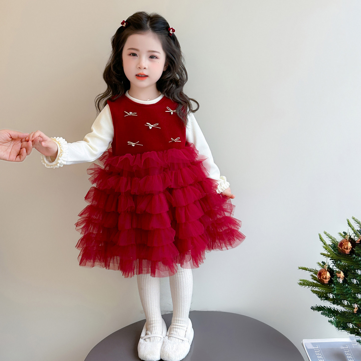 女童连衣裙冬装儿童项链过年衣服公主裙子女宝宝红色拜年服秋冬季