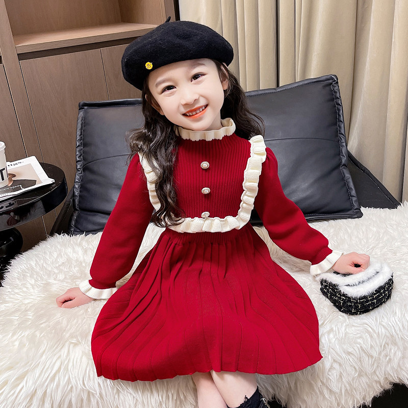 水孩儿女童连衣裙25秋冬装新款中大童红色针织裙女宝宝毛衣套裙子