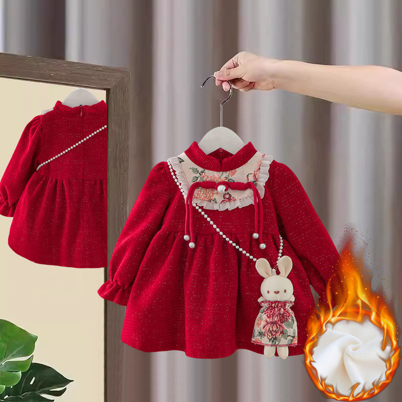 女童红色加绒儿童过年服冬季裙子玩偶新年拜年服女宝宝秋冬连衣裙