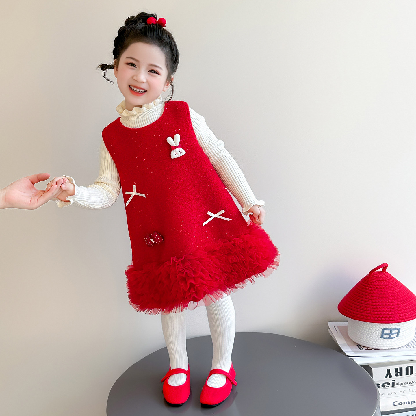 女童连衣裙兔子儿童秋冬季过年拜年服新年红色女宝宝公主裙子冬装