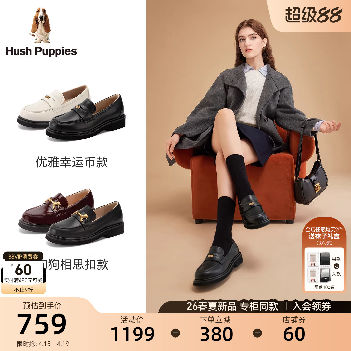 暇步士幸运币乐福鞋女2026春新款黑皮鞋厚底真皮英伦风增高休闲鞋
