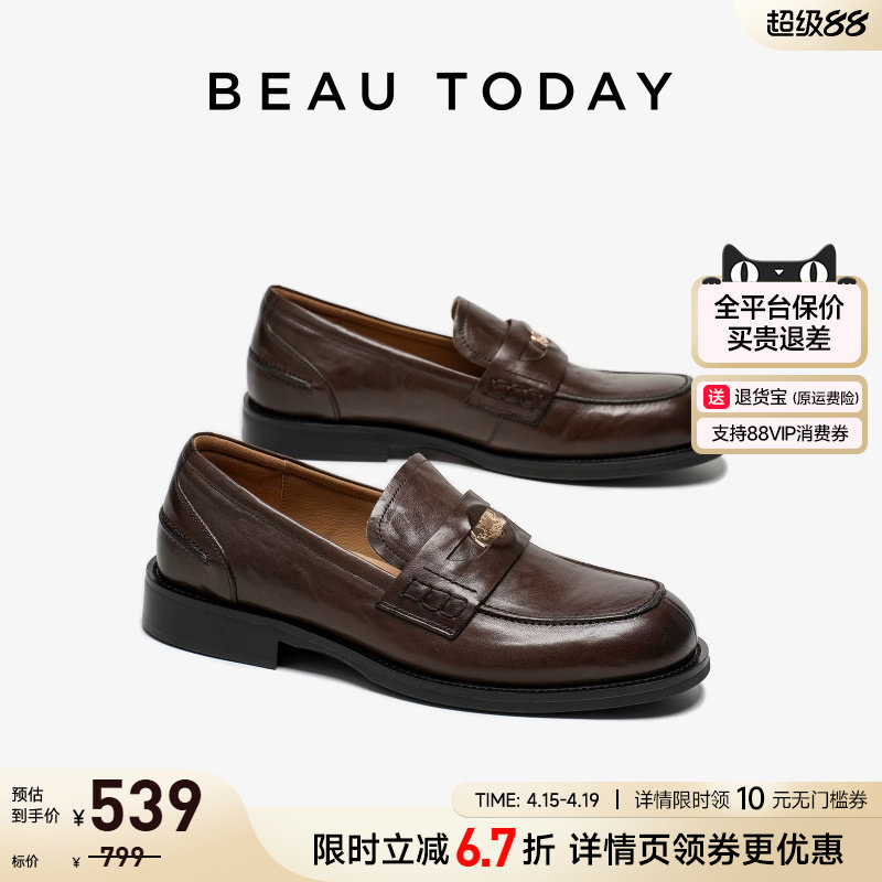 【焦糖金币】BeauToday乐福鞋女真皮英伦风小皮鞋一脚蹬棕色单鞋