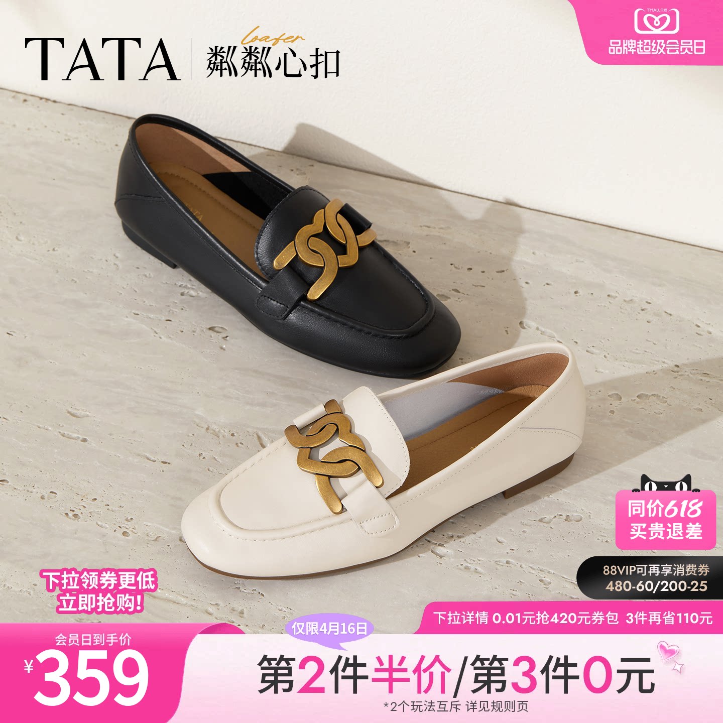 TATA他她粼粼心扣平底乐福鞋女真皮通勤单鞋百搭小皮鞋女7QC23AA4
