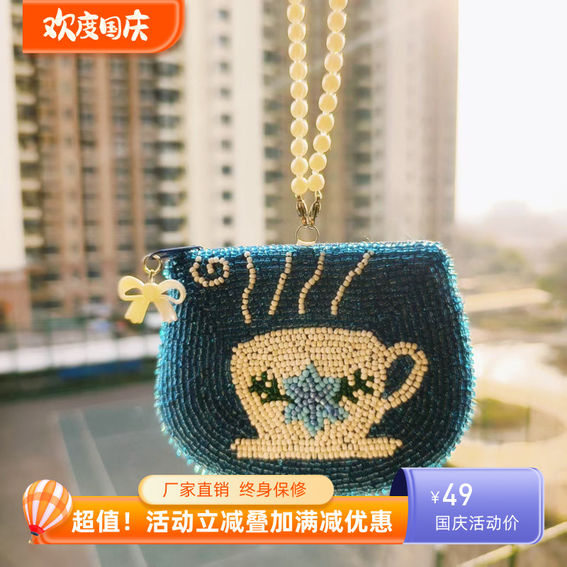原创设计手工钱包女森系时尚蓝色茶杯零钱包钉珠硬币包迷你硬币包