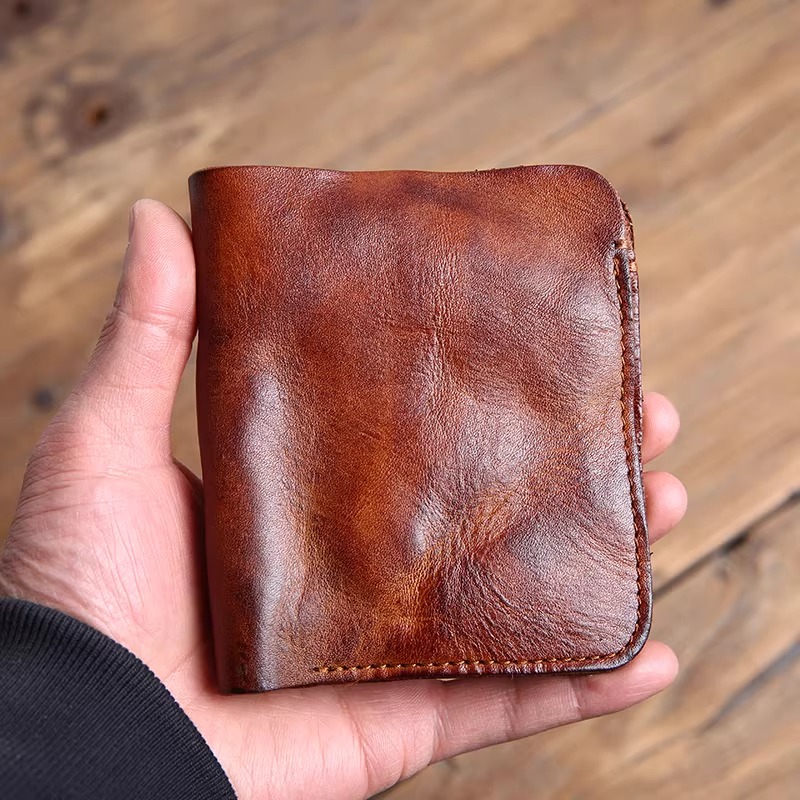 老牛家超薄日系做旧手工钱包男款短款青年日式复古植鞣牛皮皮夹女
