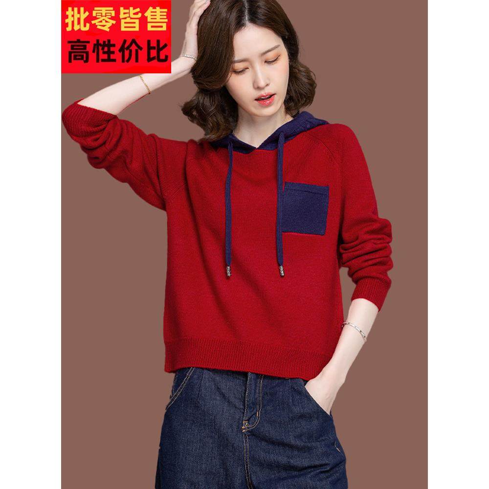 连帽红色毛衣女春装2025新款短款内搭小款配裙针织卫衣打底带帽衫